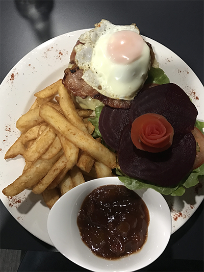 Our two-course meal was generously sized and delicious, and the sauvignon blanc was the perfect accompaniment. The menu was diverse and we were able to order a vegetarian meal without requesting any substitutions! We enjoyed the Pasta of the Day, and the Famous Nullar-Burger, as you can see in the photo below it’s quite a mouthful!